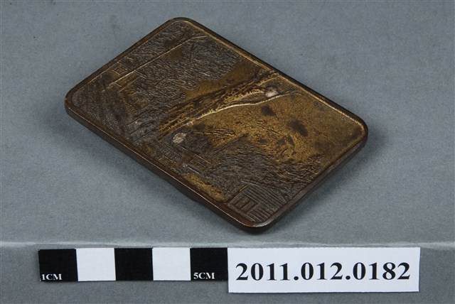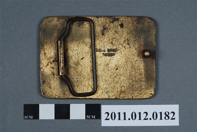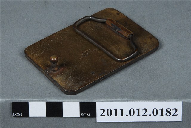 本物件為黃銅皮帶頭,正面有山林樹木(似為阿里山神木)及火車圖樣,背面刻有「SOLID BRASS」、「TAIWAN」等字樣,SOLID BRASS為「堅固的黃銅」之意,材質可能為黃銅,但無法確定製造地與年代。