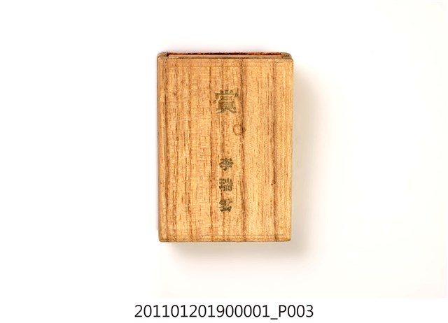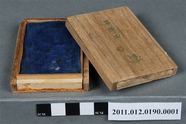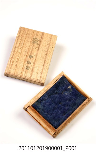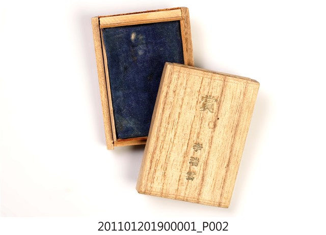 1.本物件為臺灣紀念章外盒之萬丹鄉李端雲棒球優勝賞,材質為木質,盒蓋上有「賞 李瑞雲」金色烙印字樣,盒身內有藍色絨布內襯,可放置徽章。