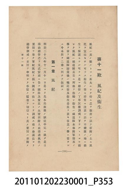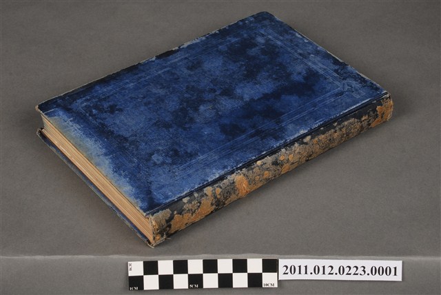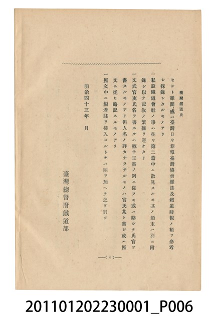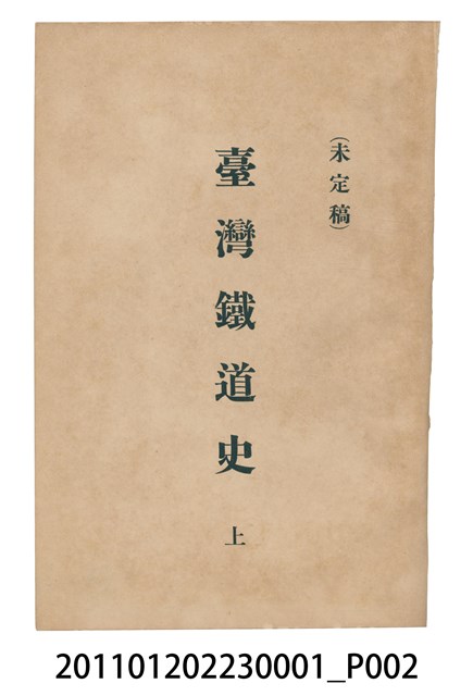本組物件為《臺灣鐵道史》上冊,封面蛀蝕嚴重,已認不出字跡,於明治43年9月30日由臺灣總督府鐵道部出版,本冊內容包含清朝時代的鐵路、日本領臺後的鐵路等。
