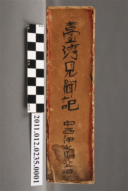 此為一紙質書籍的書殼,此書籍為1937年由中西伊之助撰寫的《臺灣見聞紀》,此書由東京實踐社於1937年出版,並於1942年由三省堂於臺灣再版。 《臺灣見聞記》是中西伊之助於1937年5至10月在臺灣行旅見聞之記錄,內容包括紀行、評論、感想、短歌、史傳等五大類。中西伊之助是當時頗具知名度的左翼文藝工作者,長期參與文藝與政治方面的組織工作並曾旅居朝鮮擔任記者。「實踐社」即中西伊之助在自主實踐的理念下所創立的出版單位。