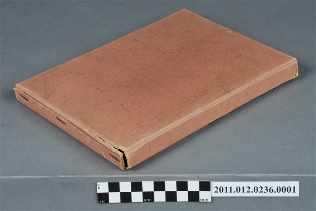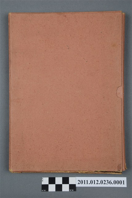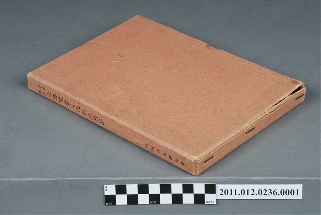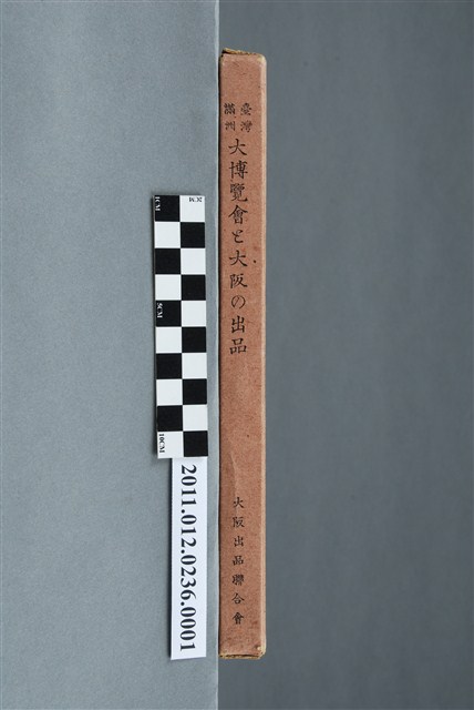 本物件為《臺湾満州大博覧会と大阪の出品》書殼,由大阪出品聯合會於昭和11年(1936)8月15日發行。書殼為赭紅色,印有「臺湾満州大博覧会と大阪の出品 大阪出品聯合會」等字樣,並由厚紙釘成外殼,略有破裂。