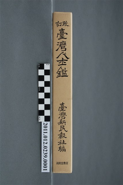 此為一紙質書殼,長28、寬22、厚3.1(cm)為《改訂臺灣人士鑑》復刻版(東京:湘南堂,1986)之附件。此物件以釘書針裝訂成形,書背位置以黑色字體標示書名及出版單位。 《臺灣人士鑑》的三次出版,分別是為紀念《臺灣新民報》日刊發行1週年、5週年、10週年紀念,此件的出版也為記錄臺灣的重要人物以達成「回顧既往人士並介紹新人物」的目標,此物件記載當時臺灣各地重要、知名人士相關資訊,如家庭成員、住所、相關經歷、人物簡介、嗜好,為紀錄日治時期人物的重要書籍。 此件的出版者臺灣新民報社,為日治時期臺灣人創辦的日報中影響最廣者,在前身《臺灣民報》時期,便自詡為「臺灣人唯一的言論機關」,於當時的政治運動脈絡裡有重要地位。在1930年,《臺灣民報》更名為《臺灣新民報》,並於1932年改為日刊發售。1941年,在日本帝國發動南向政策的時局下,《臺灣新民報》改名為《興南新聞》,同時原先批判政府的報紙風格逐漸消逝。之後,《興南新聞》與其他5份報刊在1944年被臺灣總督府整併為《臺灣新報》。