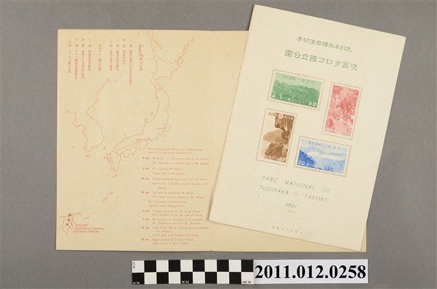 1.本物件為大日本帝國郵票,封面為米色底色,字樣為紅色,印著「大日本帝國郵便切手 臺灣大屯/次高タロコ/新高阿里山 國立公園 臺灣總督府」,內容為幾張郵票。