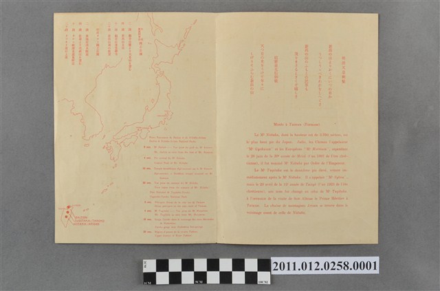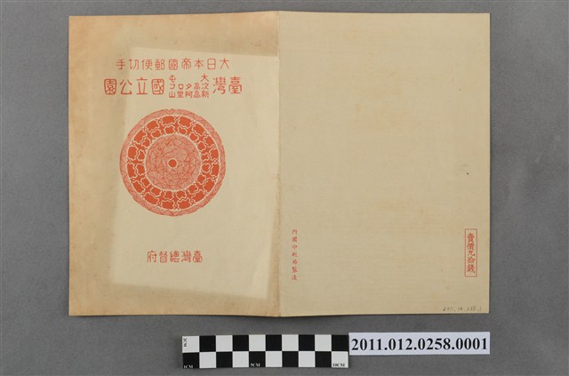 本物件為大日本帝國郵票封套,封面為米色底色,字樣為紅色,印著「大日本帝國郵便切手 臺灣大屯/次高タロコ/新高阿里山 國立公園 臺灣總督府。