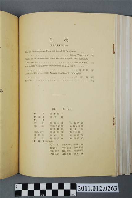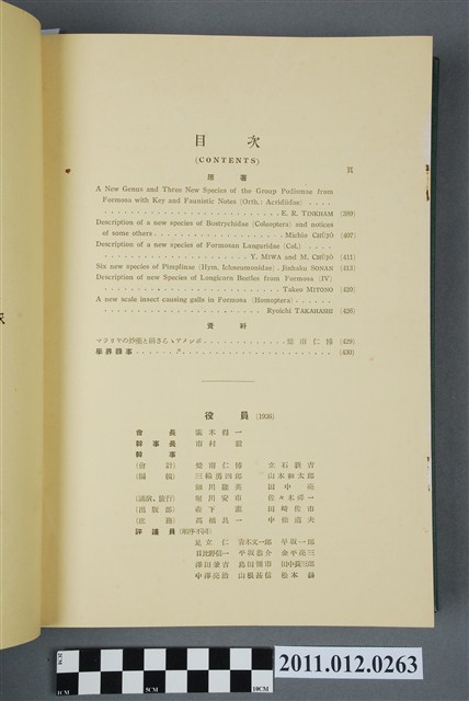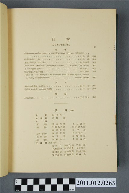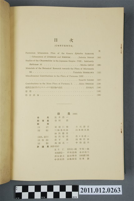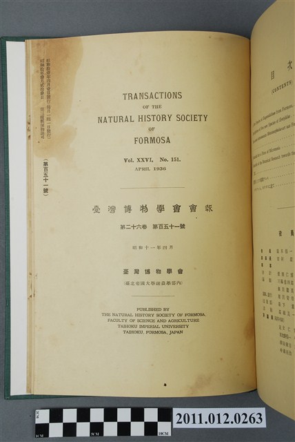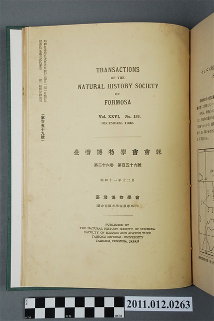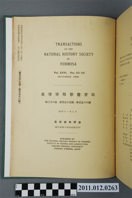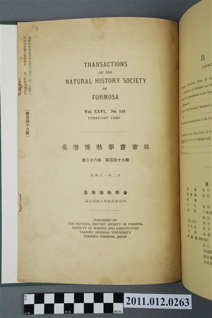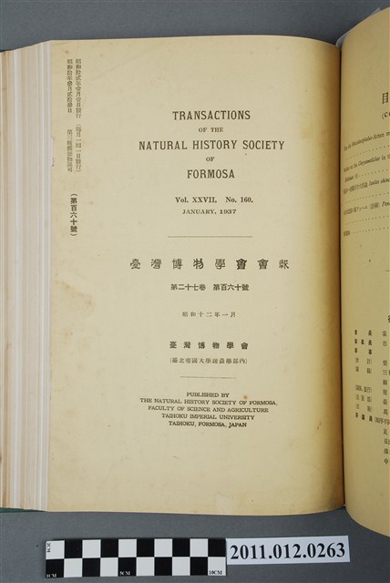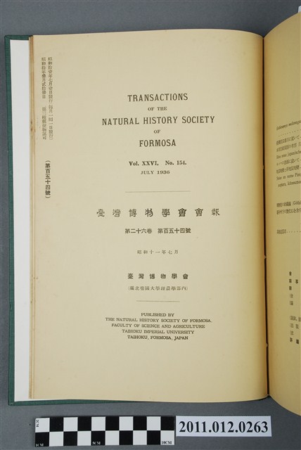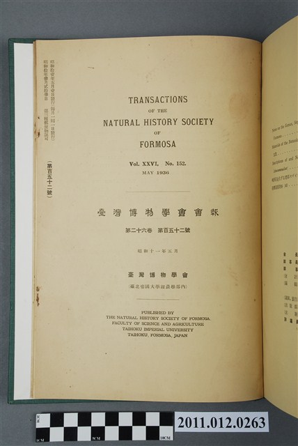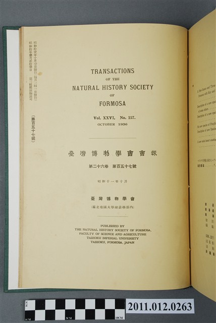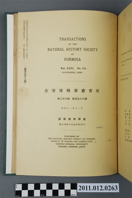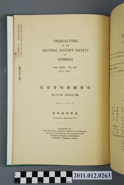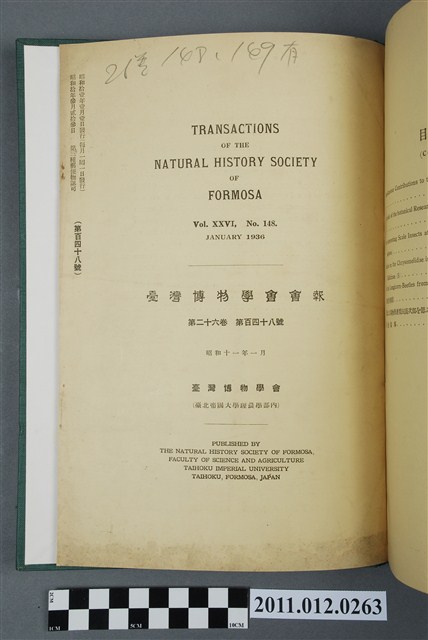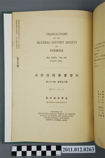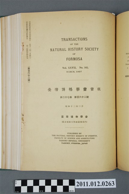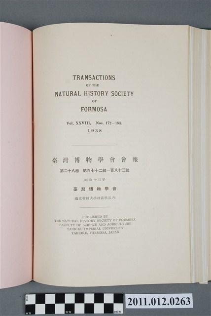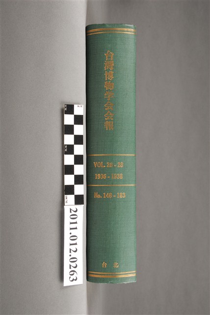 1.本組件為《臺灣博物學會會報》 第26-28卷第148-183號,時間在昭和11年-13年間。內含118/119—252號(終刊),加上臨時増刊1號。2.1910 年 12 月 10 日,總督府民政部殖產局附屬博物館館長川上瀧彌、中學校敎授木村德藏、國語學校助敎授相馬禎三郎及土木部技師大島正等人,於臺灣總督府殖產局附屬博物館會集會,發起、組織「臺灣博物學會」 (Natural History Society of Taiwan)。該學會制定的會則內容,重點包括:明揭以研究臺灣的動物、植物、礦物、地質學、人類學、氣象學等六種學問為目的。1911年創刊學會專屬期刊「臺灣博物學會會報(The Journal of Natural History Society of Taiwan)」,也使該會報成為上述研究的重要彙整園地。