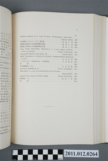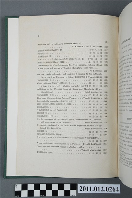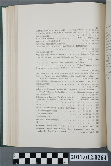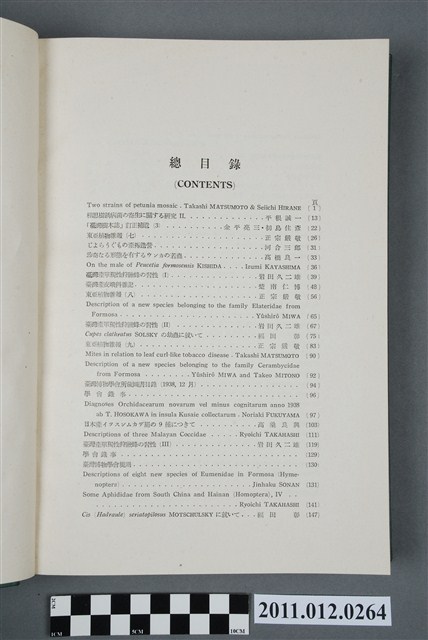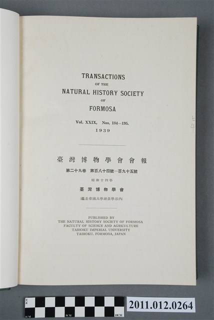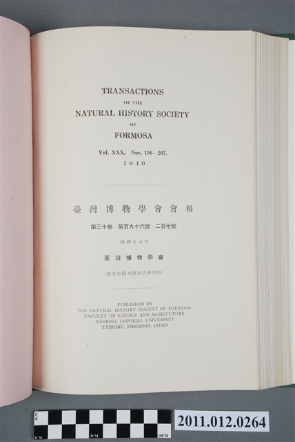 1.本組件為《臺灣博物學會會報》第29-30卷第184-207號,時間在昭和14年-昭和15年間。2.1910 年 12 月 10 日,總督府民政部殖產局附屬博物館館長川上瀧彌、中學校敎授木村德藏、國語學校助敎授相馬禎三郎及土木部技師大島正等人,於臺灣總督府殖產局附屬博物館會集會,發起、組織「臺灣博物學會」 (Natural History Society of Taiwan)。該學會制定的會則內容,重點包括:明揭以研究臺灣的動物、植物、礦物、地質學、人類學、氣象學等六種學問為目的。1911年創刊學會專屬期刊「臺灣博物學會會報(The Journal of Natural History Society of Taiwan)」,也使該會報成為上述研究的重要彙整園地。