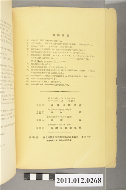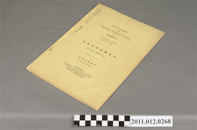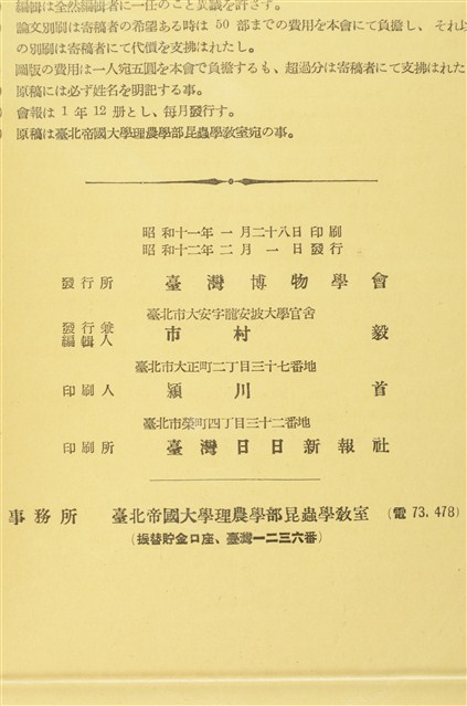 1.本件為該會報第27卷第161號,會長為素木得一,編輯兼發行人為市村毅。2.1910 年 12 月 10 日,總督府民政部殖產局附屬博物館館長川上瀧彌、中學校敎授木村德藏、國語學校助敎授相馬禎三郎及土木部技師大島正等人,於臺灣總督府殖產局附屬博物館會集會,發起、組織「臺灣博物學會」 (Natural History Society of Taiwan)。該學會制定的會則內容,重點包括:明揭以研究臺灣的動物、植物、礦物、地質學、人類學、氣象學等六種學問為目的。1911年創刊學會專屬期刊「臺灣博物學會會報(The Journal of Natural History Society of Taiwan)」,也使該會報成為上述研究的重要彙整園地。