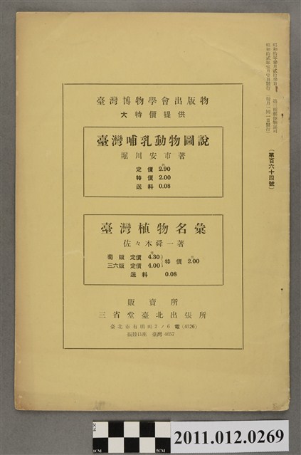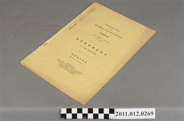 1.本件為該會報第27卷第164號,時間在昭和12年5月,會長為素木得一,編輯兼發行人為市村毅。2.1910 年 12 月 10 日,總督府民政部殖產局附屬博物館館長川上瀧彌、中學校敎授木村德藏、國語學校助敎授相馬禎三郎及土木部技師大島正等人,於臺灣總督府殖產局附屬博物館會集會,發起、組織「臺灣博物學會」 (Natural History Society of Taiwan)。該學會制定的會則內容,重點包括:明揭以研究臺灣的動物、植物、礦物、地質學、人類學、氣象學等六種學問為目的。1911年創刊學會專屬期刊「臺灣博物學會會報(The Journal of Natural History Society of Taiwan)」,也使該會報成為上述研究的重要彙整園地。