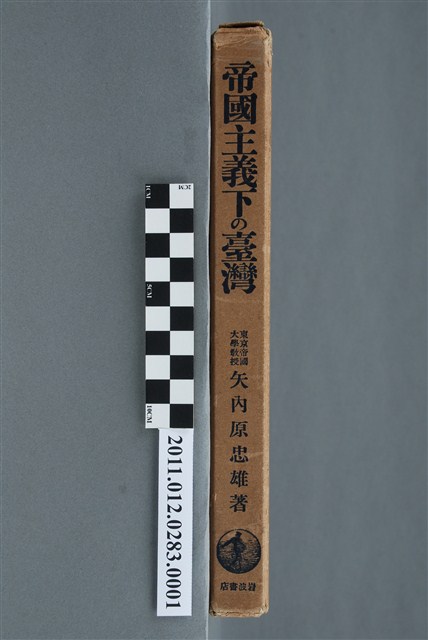此物件為《帝國主義下の臺灣》之紙質書殼,正面印有題名、著者姓名及出版單位,邊緣以釘書針裝訂。 本書內容探討臺灣的經濟、政治、教育、民族運動等問題,並探討其社會性意涵,被認定為臺灣殖民地經濟發展的劃時代著作,另外對總督府採取的「同化政策」提出強烈批判,並支持殖民地民眾的自治要求。 本書的作者矢內原忠雄出生於1893年,為日本的經濟學家、殖民政策研究者,對日本的殖民政策、資本主義政策有所批判。矢內原忠雄為出版本書,於1927年前往臺灣實地調查,並在歸國後批判臺灣缺乏政治自由及言論機關,而在1929年出版本書之時,日本的軍國主義抬頭且最終引發中日戰爭。戰爭爆發不久後,矢內原公開發表文章批判日本政府發動戰爭的行為,最終受到政府壓迫而辭去東京帝國大學校長一職,他於辭職演講中大聲疾呼:「為要活出日本的理想,請先把這個國家埋葬掉吧」。矢內原忠雄死後被日本歷史學家家永三郎評價為「日本人的良心」,而東京大學內設有矢內原門以紀念他。