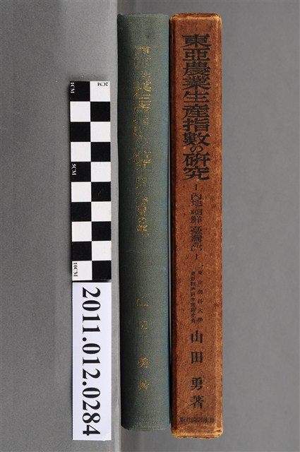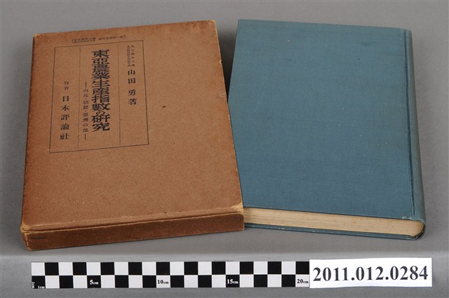 1.本物件為「山田勇著《東亞農業生產指數的研究-內地、朝鮮、臺灣之部》」,為農業相關研究書籍,作者是東京商科大學東亞經濟研究所研究員山田勇,由東京商科大學東亞經濟研究所發行,日本評論社發賣,共分兩件,一件為書殼,一件為書本。