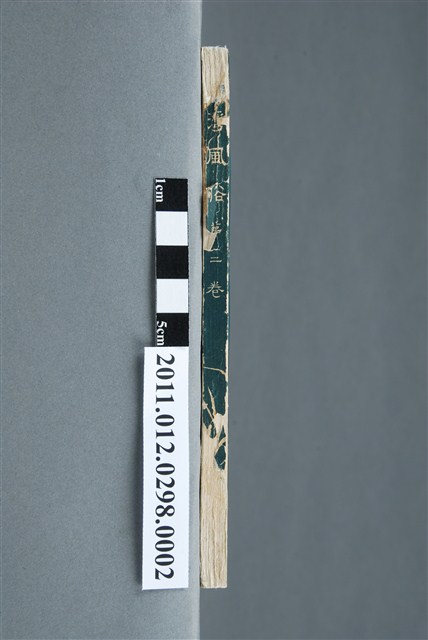 本物件為臺灣風俗第二卷,此物件為書籍,書籍外觀之正面與背面為綠色,繪有日本畫風的人物,為一女子採蹲姿,手中拿著一炷香,顯示正在祭拜其面前的骷髏,書籍標題為「臺灣風俗第二卷」(巫覡之部)。內容包括巫覡、驅邪及招福呪、匠工人的呪文及符法及普通人的呪符、身體及精神的異狀狀態及迷信、事物的觀察迷信等。