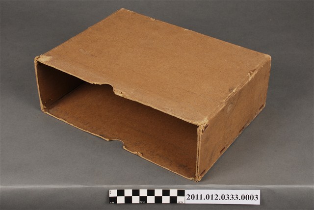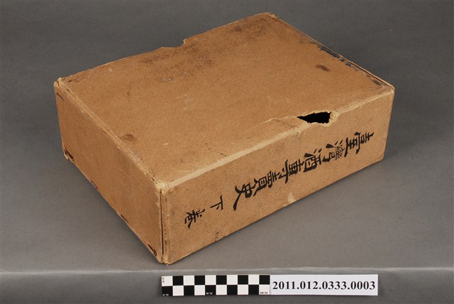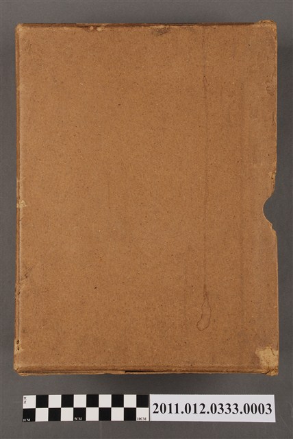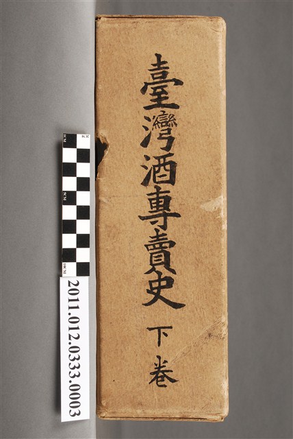 1.本物件為臺灣總督府專賣局發行《臺灣酒專賣史》下卷書殼,為硬紙板組裝而成,呈長方體狀,但留有1面無封死,內為中空可放入書本,其背脊處有「臺灣酒專賣史下卷」黑色字樣,其底部有裝訂痕跡,已有部分破損。