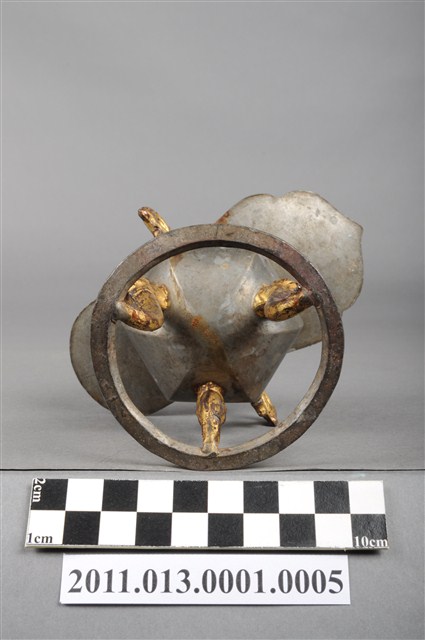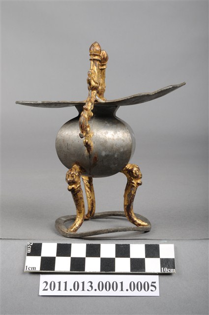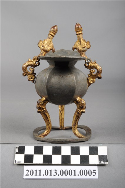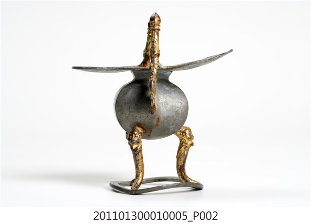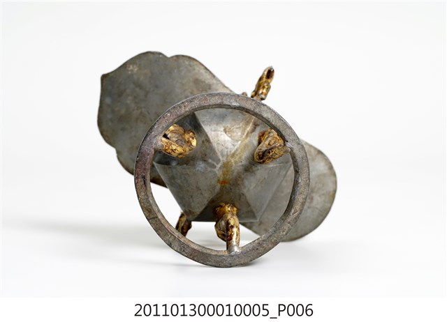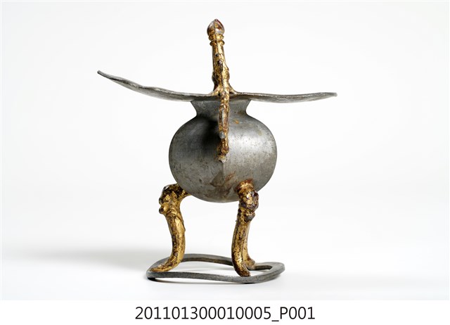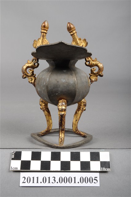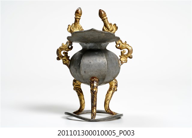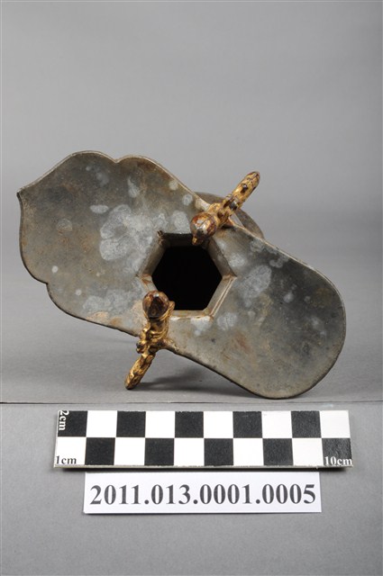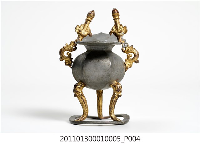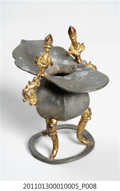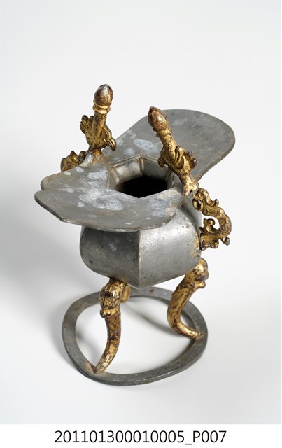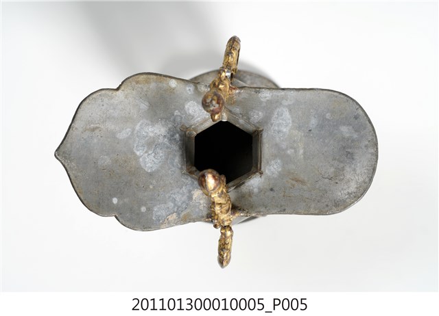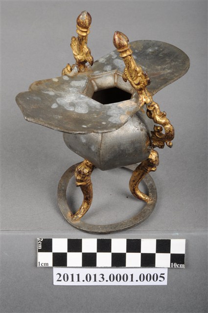 本件為三只錫製酒杯一組,器腹為六棱形,素面無紋,三高腳獸足,獸足與提耳安金。酒杯開口龜甲六角形,流口略作如意形。整體略有歪斜。酒器是盛酒祭祀神祇、祖先的重要用具。五穀所釀製的酒,乃是天地精華所成之物,用以祭祀表達虔誠之意。祀神酒杯多採古代禮器中「爵」的造型,由主祭者盛酒呈現於神前,稱為獻爵,在三獻禮中分別為初獻、亞獻、終獻。