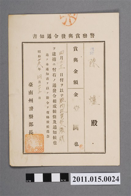 2011.015.0024 昭和16年臺南州警察部長警察獎金發布通知書