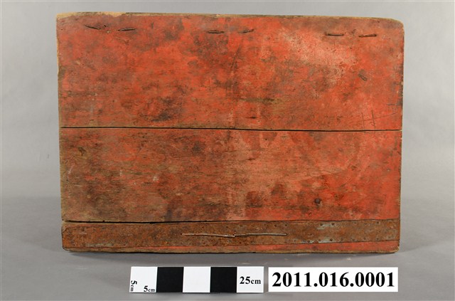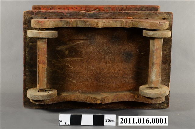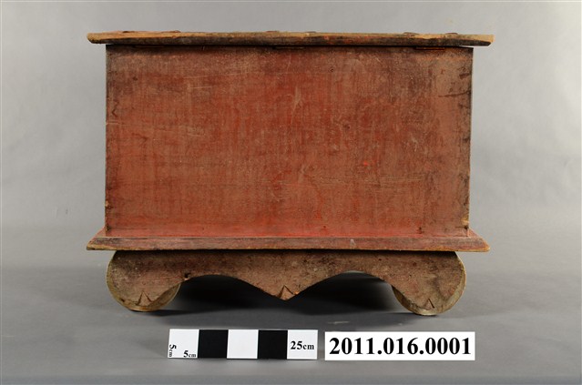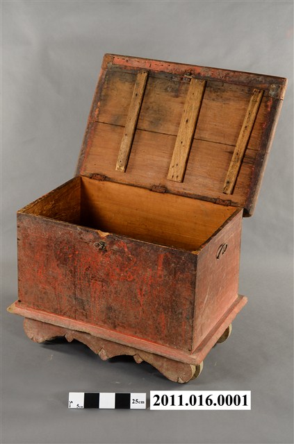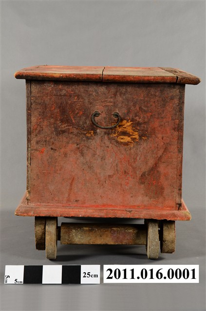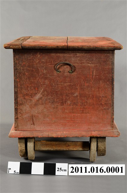1.本藏品為實木製箱子,長72.8公分、寬51公分、高52.1公分,箱體略呈上寬下窄,箱蓋與箱底木板突出,箱體可見釘子眼接合痕跡,箱底下前後做有輪子,側面則有牙子狀的護板用以固定輪軸。外表通體塗以紅色漆。