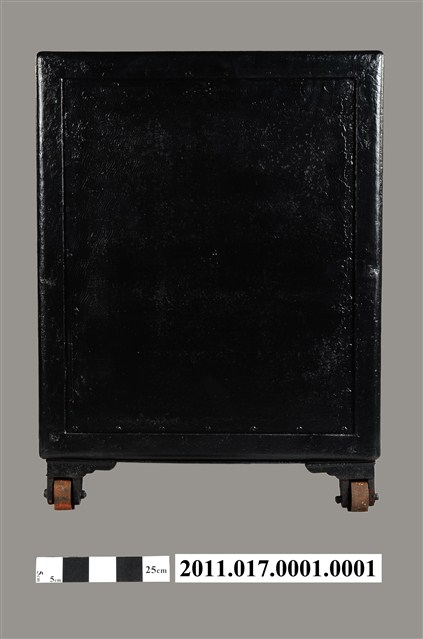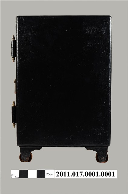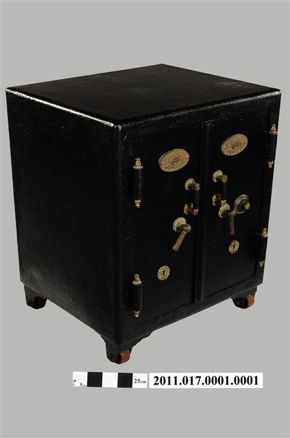 1. 黑漆長方體中型保險櫃,厚重金屬材質焊鑄而成,底部附有4個滑輪,可移動。本件保險箱據捐贈者描述為丈夫王天賜開業當時所購置之保險箱,保險箱鑰匙為鑰匙及號碼雙重鎖,重量相當重,據稱兩名壯丁亦無法輕易搬動。正面對開門板上有製造商標,正中央為商標「円」字樣,上排有「近江屋金庫店」小字,下排有「東京工場製造」及英文字「TAIWAN TAINAN SHI」 (臺灣臺南市)字樣。