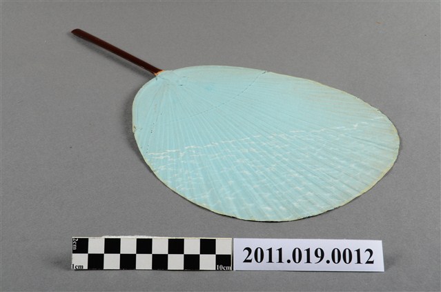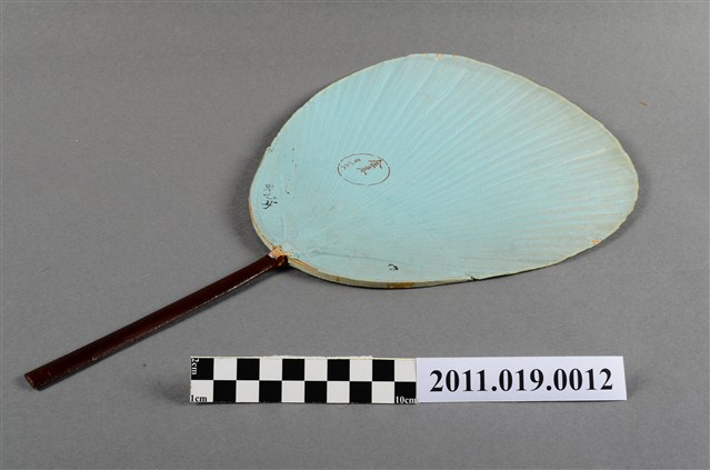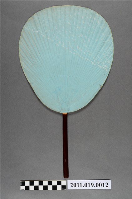 1.本件採用橢圓形扇框、雙扇面,扇柄為圓柱型。扇面均為淺藍色,紋樣方面,一面在右上方印有細密的白色波浪線條,另一面印有「金來 電一二八」字樣,扇面左下角有「早乙女」字樣。扇面邊緣有些為破損,露出扇骨。2.日治時期臺灣就開始使用扇子作為廣告宣傳品,在氣候炎熱且電扇、冷氣尚未普及的臺灣,扇子是實用性很高的廣告宣傳品。