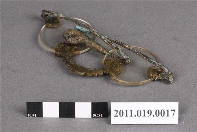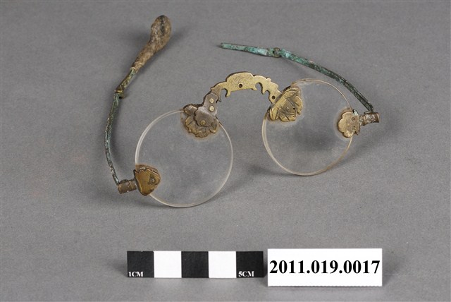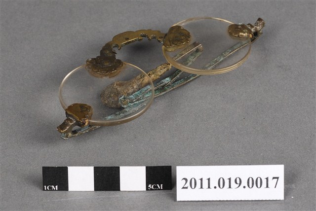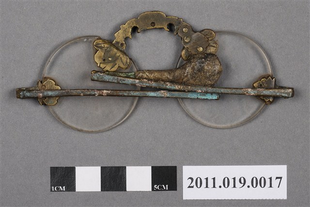 1.此件眼鏡鏡片為圓形,鼻托為花型。眼鏡沒有邊框,鼻托、鏡架與鏡片連接處為葉形金屬片。鏡架與鏡腳連接處可折疊,方便收納。鏡片部分可看到明顯刮痕。鏡架、鏡腳嚴重生鏽,產生銅綠,但仍可折疊。2.此件文物為郭双富先生捐贈。眼鏡自清代即有使用紀錄。原本為奢侈品,流行於文人間。隨著年代變遷,眼鏡逐漸成為尋常之物。