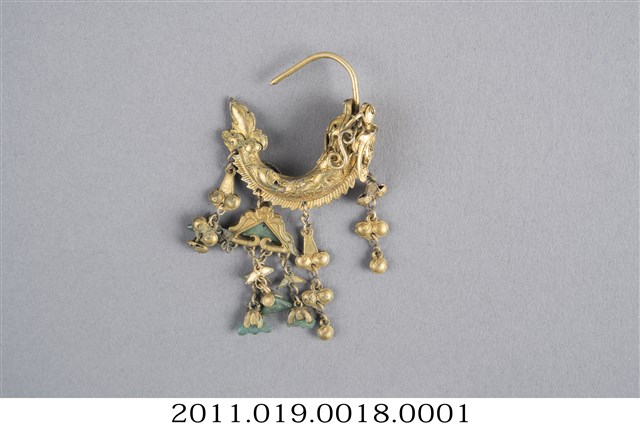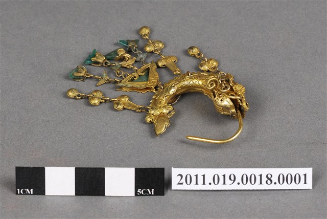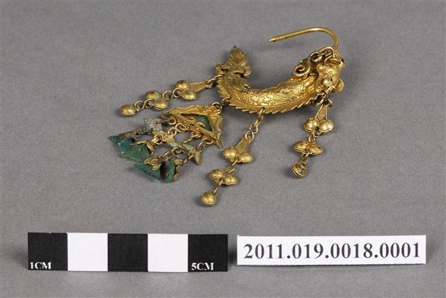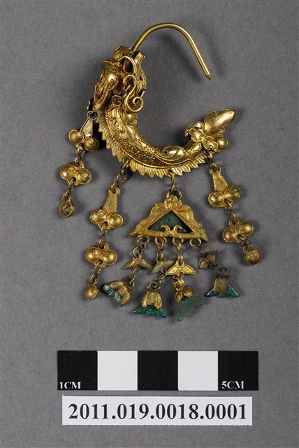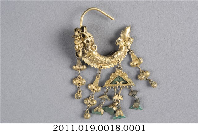 此耳墜以金屬製成龍首龍身,龍首雙目炯炯有神,張口吐水成耳鉤,龍身鱗片遍佈雲紋繚繞,向上捲曲化作龍尾,全器呈現優雅的半圓弧狀。龍背處穿四洞垂掛金屬流蘇,其中三條款式相同皆綴以圓珠片,而近尾端處則另綴如意雲頭垂飾,上方雲頭及下方葉片鑲有小三角翠玉。此物年代久遠有多處氧化痕跡,其中以銀片墜腳最為明顯。