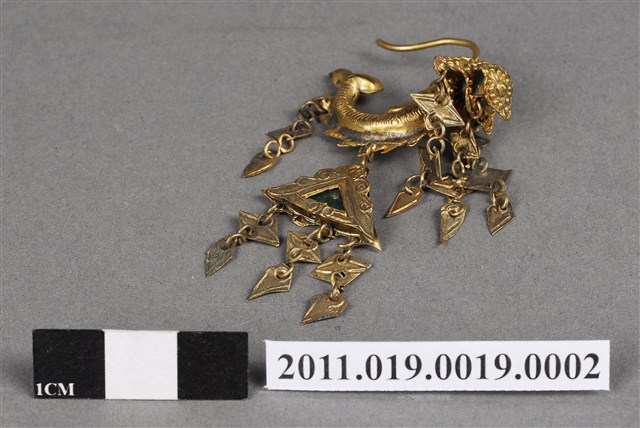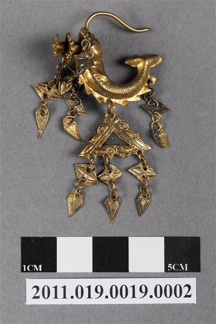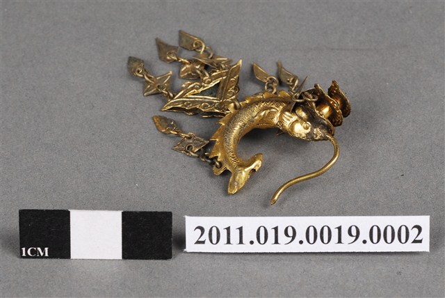 此右耳墜採用壓雕工法,將兩片金屬板壓模製成立體的魚首魚身,再彼此相互貼合而成。魚首形簡,飾有蓮蓬造型立體金屬片;魚身遍佈斜向交錯鱗紋,向上彎曲作一半圓。此耳墜全器穿四洞垂掛金屬葉片流蘇,兩洞在魚首蓮蓬處,兩洞在魚背處。魚背最底端另綴鑲翠玉如意雲頭垂飾,垂飾下方穿四洞,其中三洞同樣垂掛金屬葉片流蘇,唯一洞空缺遺漏。此物年代久遠有多處氧化痕跡,魚首魚身貼合處縫隙清晰可見。