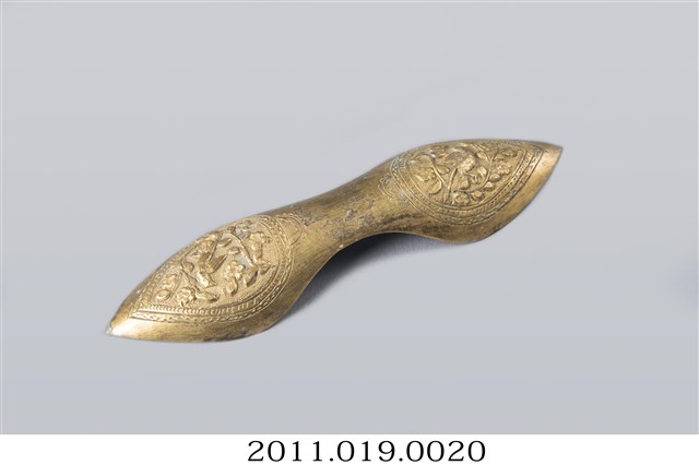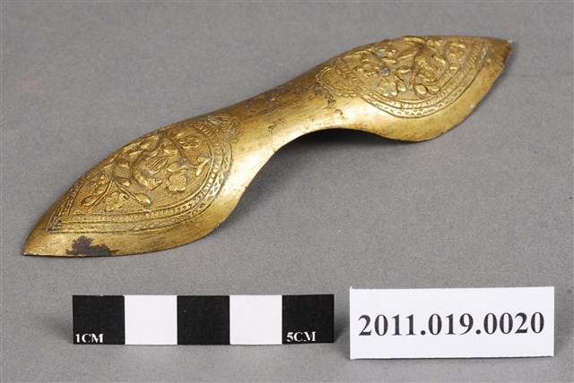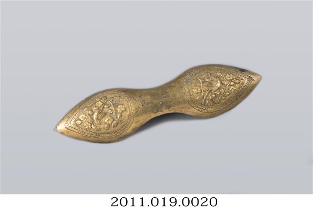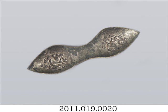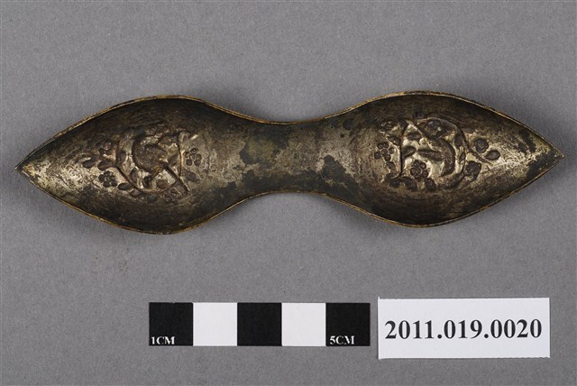 此銀簪通體狹長,沿中央線拱起如丘陵,兩端寬闊而中間縮腰。縮腰處素面無紋飾,梳髻時插之於髮間固定,露出兩端的喜鵲登梅吉祥圖樣。古人認為喜鵲是報喜之鳥,見之聽之必有喜事將臨。穿戴使用寓意吉祥的圖案,既美觀又吉利。此種形制的髮簪盛行於清代,至民國初年仍廣為流行。