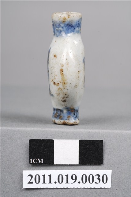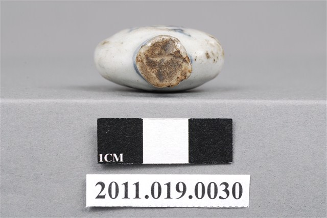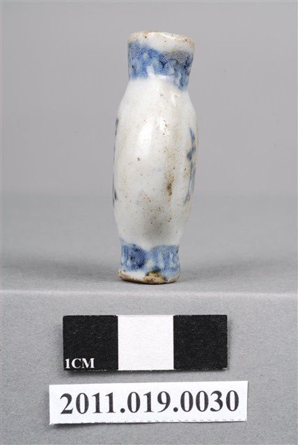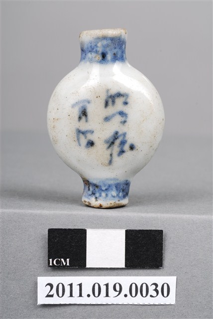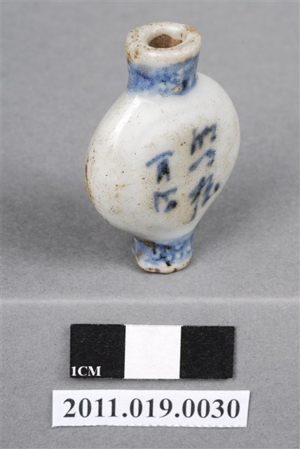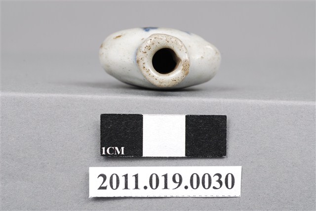 1.本物件為瓷器鼻煙壺,材質為瓷,為瓶裝容器,呈上下兩端窄中央瓶身寬之樣式,瓶身為白色,正反兩面皆有藍色字樣,但無法辨識,上下兩端有藍色花紋,上端開有孔,底端為封死,整體類似於青花瓷樣式,以沾染髒污。