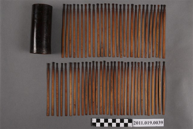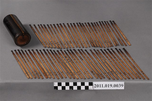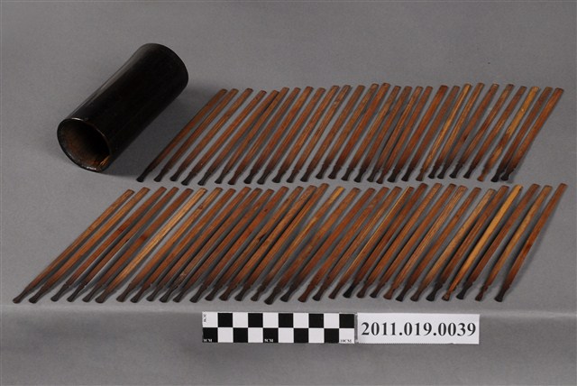 本件分成兩個物體,一是籤筒,二是籤。籤筒為竹製圓形之裝籤的容器,深黑褐色無刻字樣,有一處裂縫,已修補故顏色不同。籤為占卜的工具,形狀細長,以竹片製成,頂端刻成葫蘆狀,中間及末端各有籤號。籤號從第1至64號,中間缺4支(第19、27、48、51號),計60支。根據捐贈者表示,籤筒與籤出自於竹南、通霄一帶。