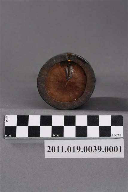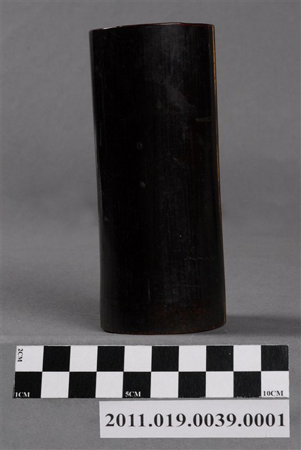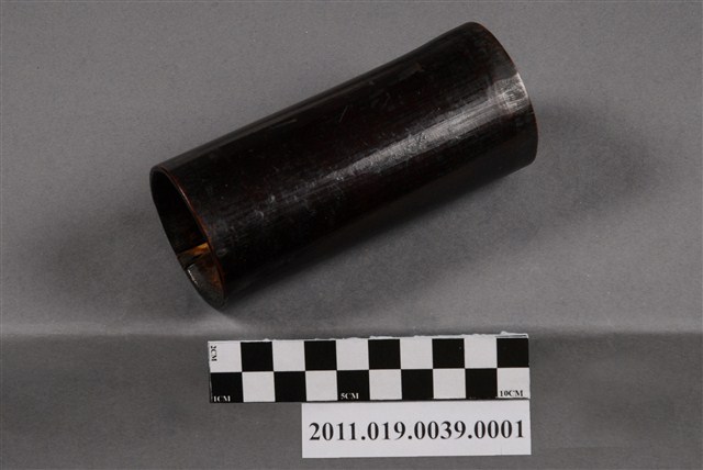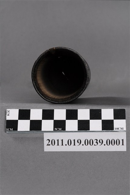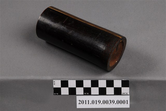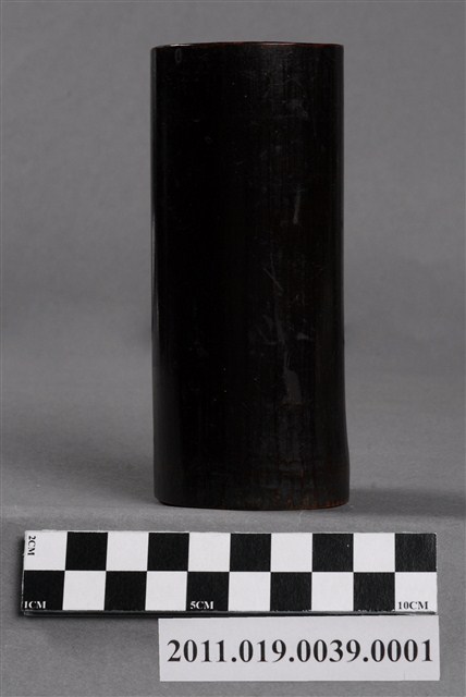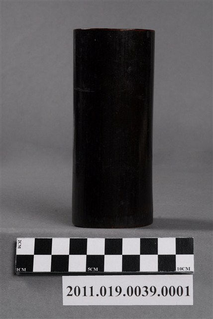本件為竹子製成圓形之裝籤的籤筒,籤筒呈現深黑褐色無刻字樣,有一處裂縫,已修補故顏色不同。屬於小型放置在桌上適合手持搖晃。籤筒材質有竹、木或是金屬等等,形狀有圓形、六角形、八角形等等。小型置供桌,大型則為立地式,內部挖洞將籤支放入以利抽籤。