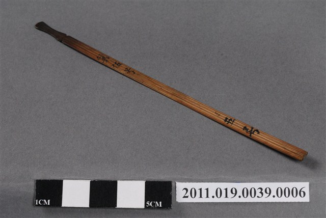 本件籤以竹片製成,形狀細長,頂端刻成葫蘆狀,使搗籤時容易抽取,亦表示「福氣」。中間有「第伍號」、末端有「五號」字樣。依據籤的編號,可以找到籤詩。抽籤是占卜的其中一種方式,從商朝人就已開始運用龜甲、牛骨進行占卜;最晚於宋代就已經出現的籤詩是當時文人雅士參與抽籤活動時,所編寫的一些附會詩詞。
