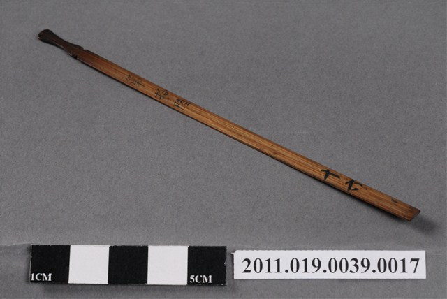 本件籤以竹片製成,形狀細長,頂端刻成葫蘆狀,使搗籤時容易抽取,亦表示「福氣」。中間有「第拾陸」、末端有「十六」字樣。依據籤的編號,可以找到籤詩。抽籤是占卜的其中一種方式,從商朝人就已開始運用龜甲、牛骨進行占卜;最晚於宋代就已經出現的籤詩是當時文人雅士參與抽籤活動時,所編寫的一些附會詩詞。