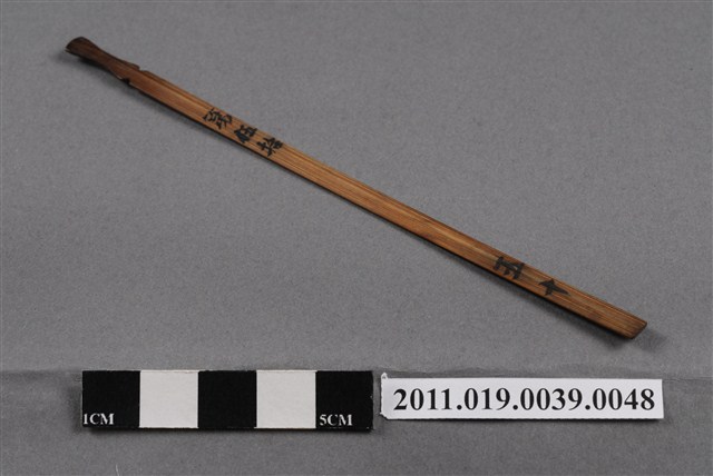 本件籤以竹片製成,形狀細長,頂端刻成葫蘆狀,使搗籤時容易抽取,亦表示「福氣」。中間有「第伍拾」、末端有「五十」字樣。依據籤的編號,可以找到籤詩。抽籤是占卜的其中一種方式,從商朝人就已開始運用龜甲、牛骨進行占卜;最晚於宋代就已經出現的籤詩是當時文人雅士參與抽籤活動時,所編寫的一些附會詩詞。