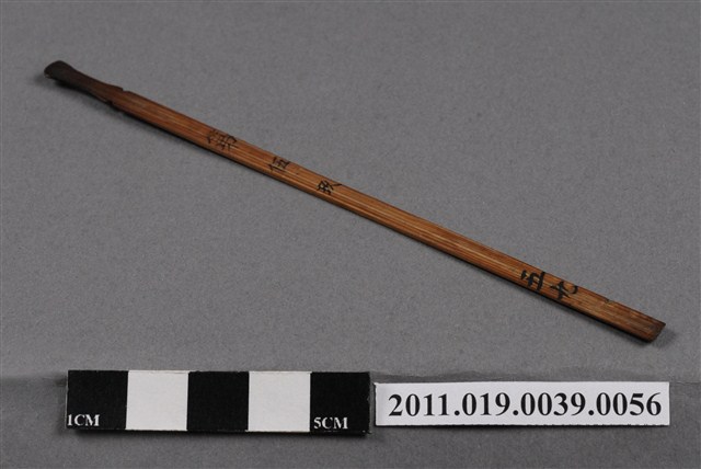本件籤以竹片製成,形狀細長,頂端刻成葫蘆狀,使搗籤時容易抽取,亦表示「福氣」。中間有「第伍玖」、末端有「五久」字樣。依據籤的編號,可以找到籤詩。抽籤是占卜的其中一種方式,從商朝人就已開始運用龜甲、牛骨進行占卜;最晚於宋代就已經出現的籤詩是當時文人雅士參與抽籤活動時,所編寫的一些附會詩詞。