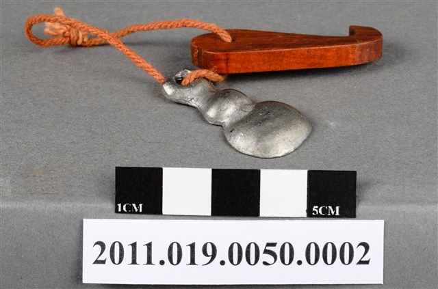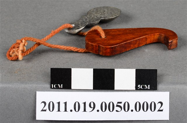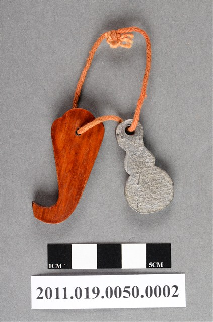此件為傳統女性足部飾品,形似環狀故稱腳環。此環造型簡樸,以繩穿過兩個配件後打結成環。配掛之葫蘆以銀片壓模剪製而成,葫蘆一面凹凸一面平整;另一配件則以木頭雕刻而成,一端寬闊如雲頭一端彎曲上翹,形似纏足婦女所穿之弓鞋。兩個配件皆為素面無紋飾,頂端穿洞以供繩索通過串連。腳環乃為舊時纏足婦女所用,套在腳踝以便固定小腳的弓鞋飾褲。民間常見以金屬打造的環,環中綴有金屬掛墜或銀鈴,使纏足女性舉腳走路之際,彼此晃動撞擊而叮噹作響,兼具功能、裝飾與聲韻之美。