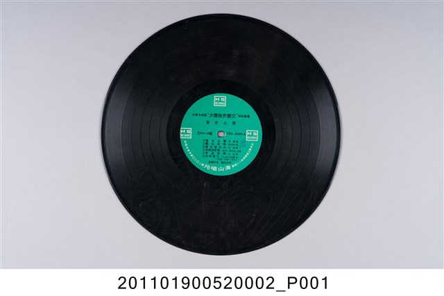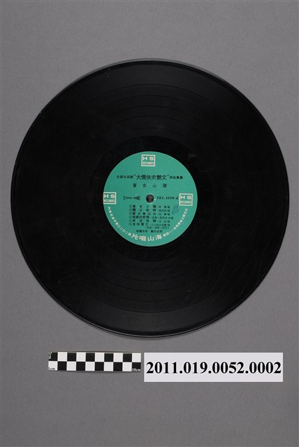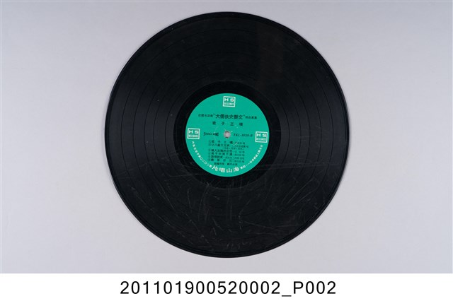 1.本物件為臺視布袋戲大儒俠史艷文插曲之專輯唱片,塑膠材質。該唱片正面可見「台視布袋戲 大儒俠史艷文插曲專集」、「君子三嘆」、「小二齒三兄弟」、「被人放捨的女性」、「男子中男子漢」、「談情說愛」、「豬哥仔」、「海山唱片」字樣。唱片背面可見「盲女新生」、「隨在你啦」、「要去做你去」、「純真的愛情」、「更深夜靜」、「昔時賢文」、「海山唱片」字樣。
