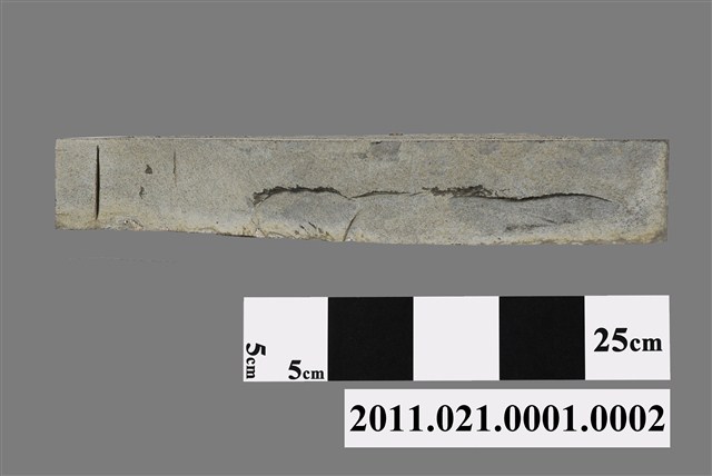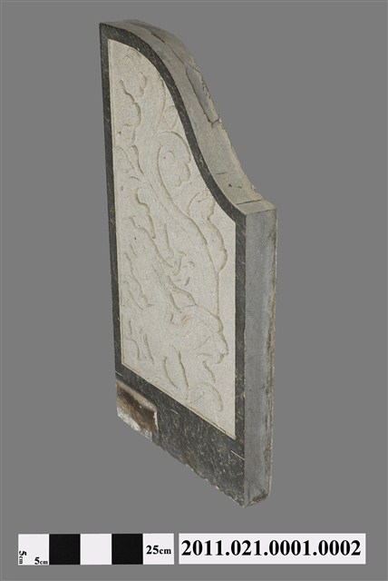 本組文物為著名石雕匠師施天福墓的石雕墓耳組之一,位於龍邊。墓耳位於墓碑兩旁,左右各一,為上端曲形的長條石片,較長的一側與墓碑相接,與墓碑形成中高旁低的牌樓面型式。墓耳以兩種石材鑲嵌,外框綠色,螭虎圖樣為白色石材。石材購自觀音山石材店,應為進口石材。主要以電動機具雕製。墓碑立碑時間為民國庚申年陽月,故可明確確定製作時間。根據收藏資料來源,本文物由施天福之子,亦為石雕匠師施弘毅製作並安置。