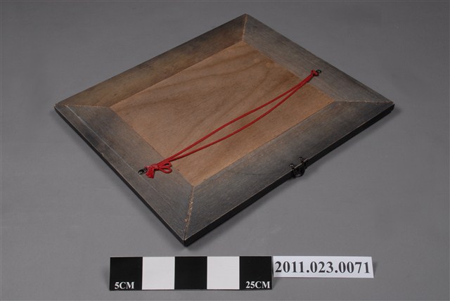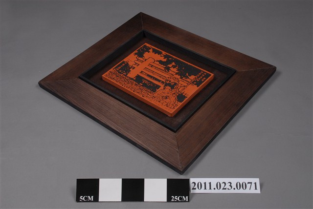 推測本件為捐贈者於民國93年由國立臺灣工藝研究所所長升任文建會副主委,由工藝所技術組同仁致贈紅陶紀念壁飾祝賀,上有工藝所文化館建築外觀圖飾。