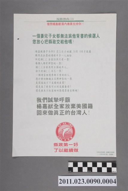 楊嘉猷1993年競選第12任臺中縣長負面文宣傳單「豐原人還能再支持廖了以嗎」