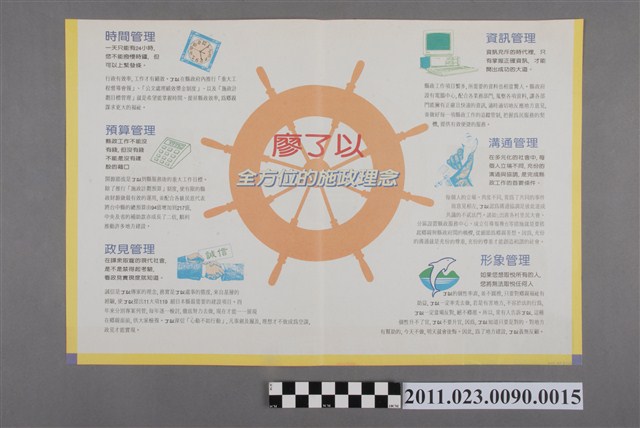 內容為廖了以提出全方位的施政理念,以及「乾淨」、「效率」、「行動派」競選標語精神說明。