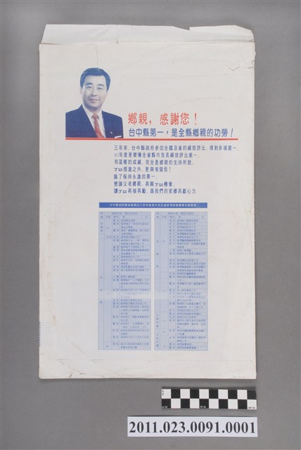 此物件為選舉宣傳單,標題為「乾淨•效率•行動派 山海屯共同體」 ,為廖了以在臺中縣長選舉中的競選廣告,宣傳紙扇以海豚為主要形象,附一印有其參選相關資訊的信封。 此物件提到的選舉為1993年中華民國第12屆臺中縣長選舉,此次選舉中代表中國國民黨的廖了以以58%的得票率擊敗代表民主進步黨的楊嘉猷,然而此次選舉中作為代表臺中地方派系「黑派」的顏清標因與代表「紅派」勢力的廖了以不合,因此轉而支持楊嘉猷。 此物件提到的人物為廖了以,曾擔任臺中縣豐原市市長、第11、12屆臺中縣長、總統府國策顧問、內政部部長、總統府秘書長、總統府資政,且曾因其母親為日本人的身分因而擔任亞東關係協會會長(後為臺灣日本關係協會),廖了以的施政作風強硬、求好心切,卻也因此樹敵頗多。