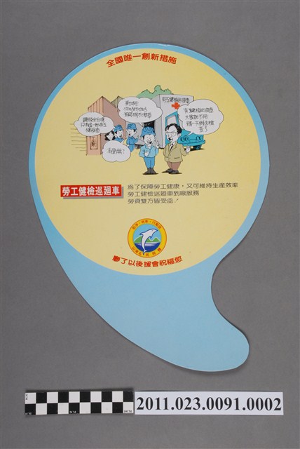 此物件為選舉宣傳單,標題為「乾淨•效率•行動派 山海屯共同體」 ,為廖了以在臺中縣長選舉中的競選廣告,宣傳紙扇以海豚為主要形象,附一印有其參選相關資訊的信封。 此物件提到的選舉為1993年中華民國第12屆臺中縣長選舉,此次選舉中代表中國國民黨的廖了以以58%的得票率擊敗代表民主進步黨的楊嘉猷,然而此次選舉中作為代表臺中地方派系「黑派」的顏清標因與代表「紅派」勢力的廖了以不合,因此轉而支持楊嘉猷。 此物件提到的人物為廖了以,曾擔任臺中縣豐原市市長、第11、12屆臺中縣長、總統府國策顧問、內政部部長、總統府秘書長、總統府資政,且曾因其母親為日本人的身分因而擔任亞東關係協會會長(後為臺灣日本關係協會),廖了以的施政作風強硬、求好心切,卻也因此樹敵頗多。