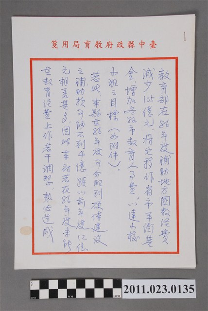 2011.023.0135 臺中縣政府教育局局長洪慶峰簽陳於臺中縣長廖了以85年4月28日請示單