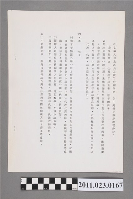 本文物為臺中縣優秀運動教練及選手優先派用國民小學代理代課教師實施要點。內容共5條,計2頁。5條內容分別為依據、目的、實施要項、考核、核准備查。此要點目的有兩點,一為提升本縣體育水準,二為解決優秀運動教練及選手之就業及生活問題。推測此要點應為臺中縣政府教育局所擬定。