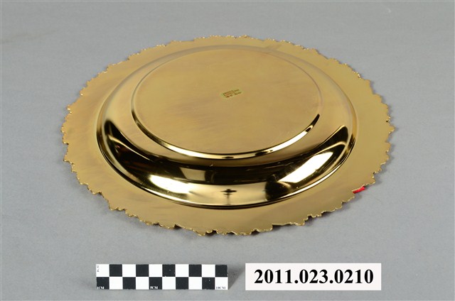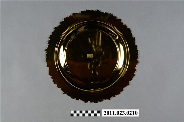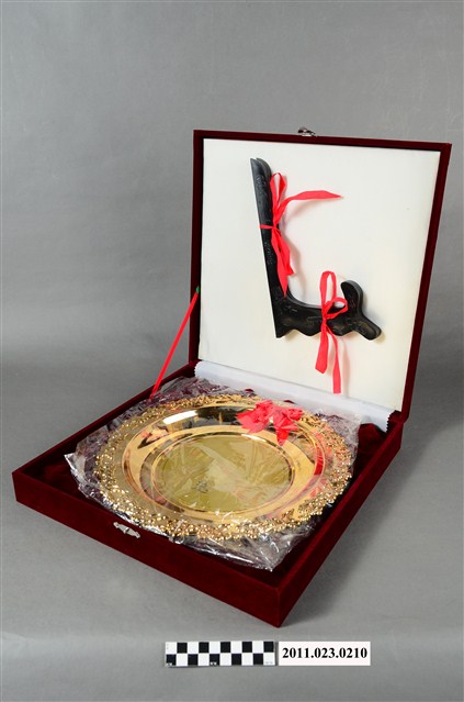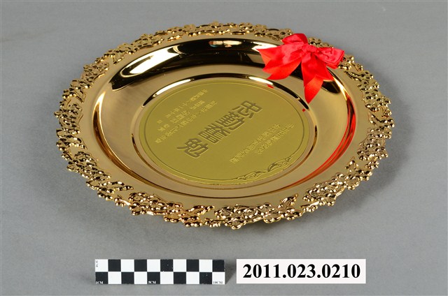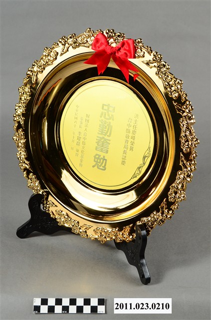 捐贈者於民國81年(1992)10月由臺中縣立文化中心主任升任臺中縣教育局長時,由財團法人臺中縣文化基金會董事長李耀群致贈「忠勤奮勉」紀念金盤,祝賀「洪主任慶峰榮昇臺中縣教育局長」。附外盒及塑膠支架各1個。