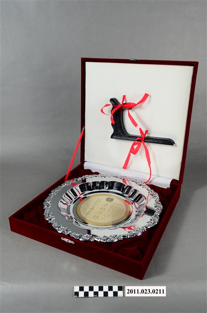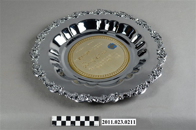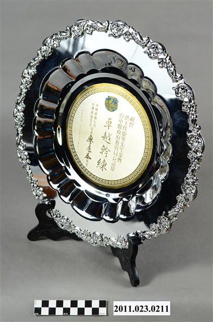 捐贈者於民國81年(1992)10月由臺中縣立文化中心主任升任臺中縣教育局長時,由中國廣播公司臺灣廣播電台台長廖遠泰致贈「卓越幹練」紀念銀盤,祝賀「洪主任慶峰先生榮膺臺中縣政府教育局長」,日期「中華民國82年4月吉日」。附外盒及塑膠支架各1個。獎盤背面貼有製造商「精華工藝社」之貼紙。精華工藝社位於臺中市湖北街84巷3號,專營紀念旗、紀念品、贈品、獎杯、獎牌。