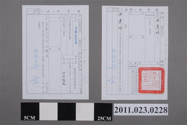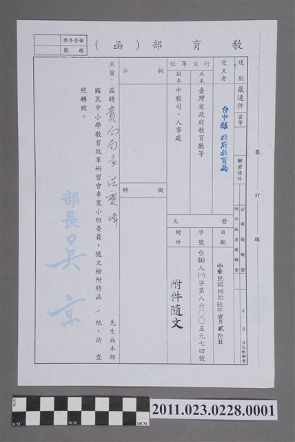 2011.023.0228.0001 洪慶峰教育部函1997年教育部國民中小學教育改革研習會專案小組委員