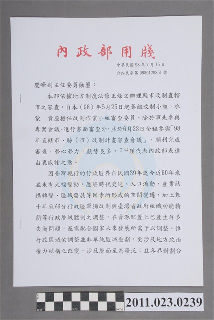 2011.023.0239 洪慶峰內政部用牋2009年縣市改制直轄市審查