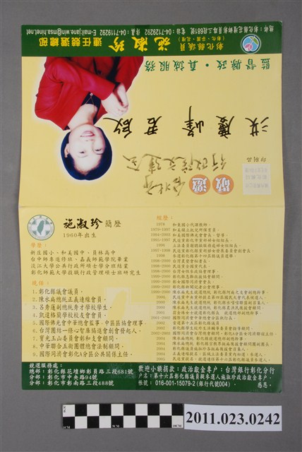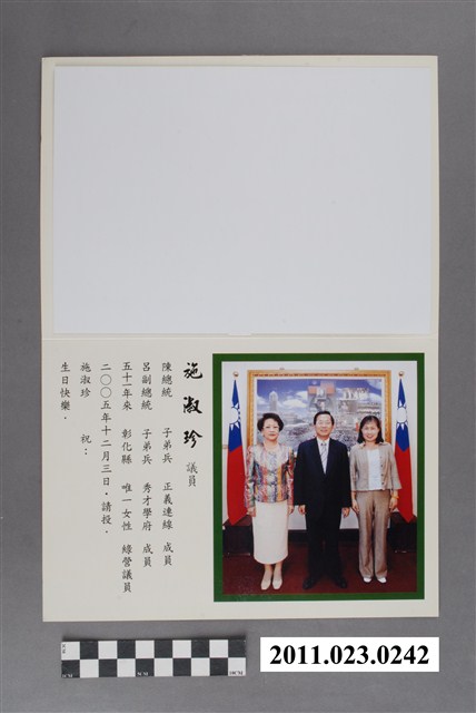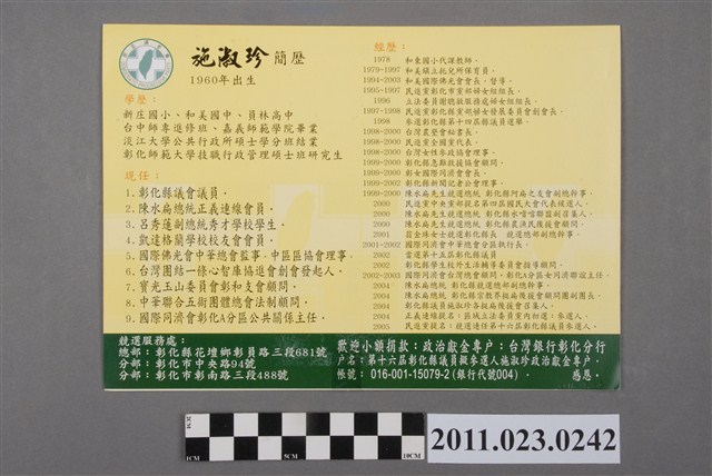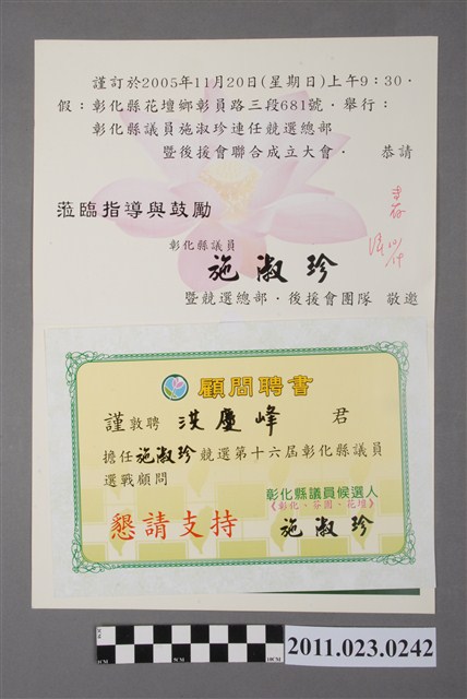 為施淑珍競選團隊於2005年11月成立競選總部前寄與時任文建會副主委洪慶峰之邀請函。2005年三合一選舉,合併了縣市長、縣市議員暨鄉鎮市長選舉,10月4日登記截止,10月31日審查候選人資格,11月11日號次抽籤, 12月3日投票。現任彰化縣議員施淑珍代表民主進步黨,尋求連任,提名為彰化、芬園、花壇地區的彰化縣縣議員候選人,提出「監督縣政、真誠服務」競選標語,於2005年11月20日成立競選總部暨後援會成立大會。邀請函中附有「顧問聘書」,聘任洪慶峰先生為「施淑珍競選第16屆彰化縣議員選戰顧問」;以及與總統陳水扁、副總統呂秀蓮合照,顯示其為扁系,主打總統牌。然選舉結果為施淑珍連任失敗。