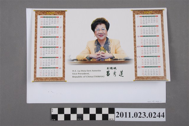 計有信封及賀年卡各1件,為副總統呂秀蓮辦公室於2007年元旦前夕寄與時任文建會副主委洪慶峰之賀年卡片。寄件人副總統辦公室寄發,信封印有「總統府」圖案,賀年卡為立卡形式,正面為莊明景攝影之「玉山雪景」圖,名為「神聖臺灣」,背面為2007年曆表,上印有副總統呂秀蓮個人照。