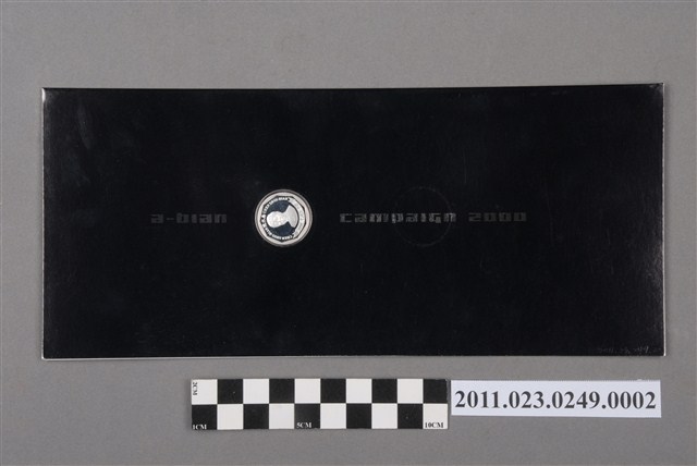 卡片鑲嵌「陳水扁2000總統大選紀念」銀幣,色彩主色為黑、銀二色。