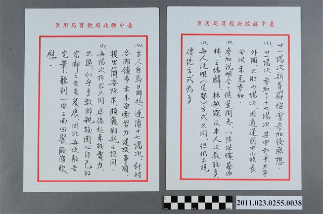 洪慶峰於1997年登記國民黨臺中縣長提名時,記錄1997年參加21場次新春聯誼會後感想,以「臺中縣政府教育局用箋」書寫。當時洪慶峰時任臺中縣教育局局長。共2頁。